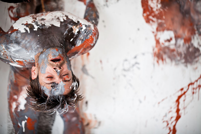 In interaction with the spectators, the initiated, Giuseppe Bucci, engages in his rite of passage alongside his guide, Véronique de Freudenreich. The duo's performance combines the media of paintbrushes, skin and movement to move across eleven metres of paper. The project revisits how humans act out their rites of passage. Throughout the stages of the performance's evolution, the initiated experiences perpetual purification through the transformation of his own movements and their vibration. This venture is an onerous journey into the unknown, often marked by pain and anguish. The initiated endures chaotic phases of profound introspection, akin to a trance-like state. The painting emerges and bears witness to his inner metamorphosis: a passage of light, a sequence of forces, resembling a spiritual reconstruction.